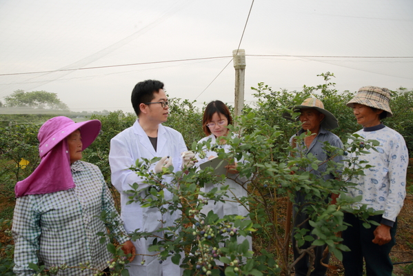 农林与服装学院刘冬、李萍博士向农户讲述农药残留快速检测技术,普及蓝莓绿色生产的重要性。(闻胜海 摄)