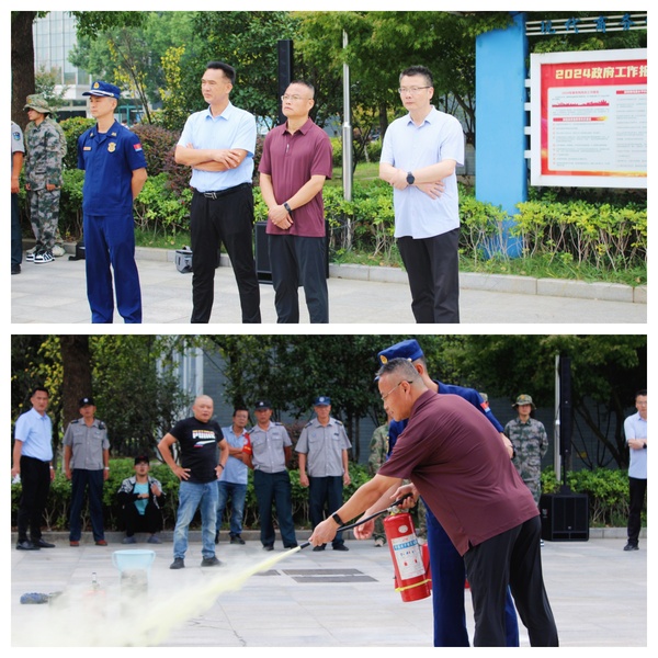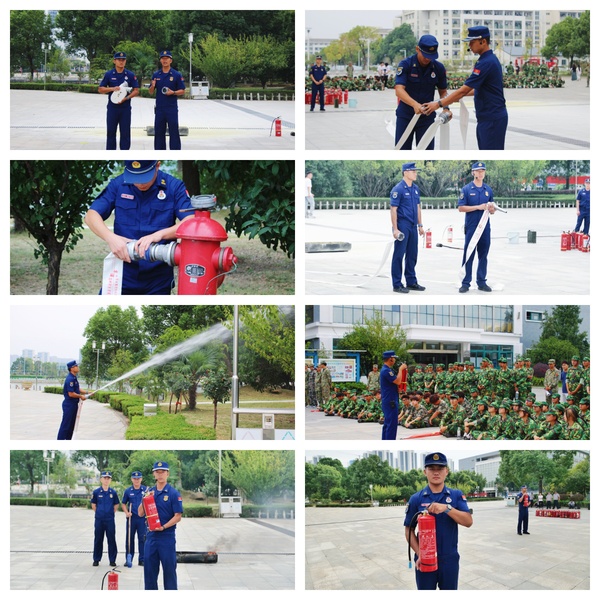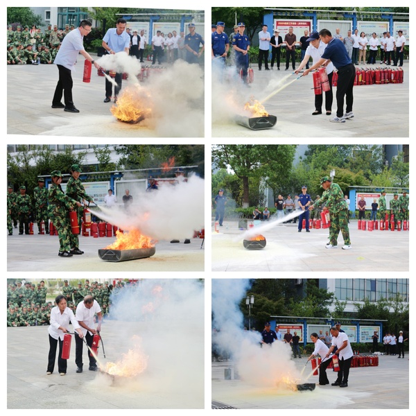 在图文中心广场上,消防救援站副站长王爱民等进行消防灭火器材的现场培训,他们分步骤操作展示并详细解析灭火器及消防水带的使用流程及注意事项。随后悉心指导大家分组进行演练。