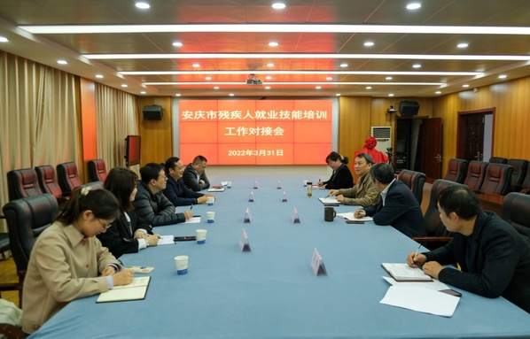 2022年3月31日下午,安庆市残疾人联合会党组书记张驰率队来校对接残疾人就业技能培训工作。校党委书记童宏葵出席会议并讲话,党委副书记李克让主持,培训部相关同志参加了会议。