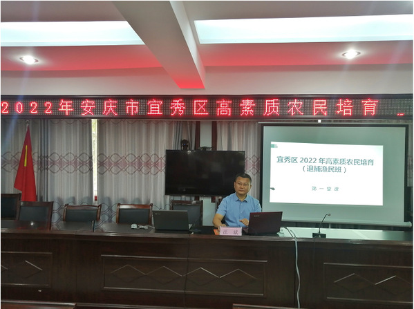 宜秀区农业农村局汪斌为学员上了第一节课,他指出本次培训班的开设旨在帮助退捕渔民能够学习科学技术知识,传播水产养殖技术,不断满足广大农民对新知识、新技术的需求,为发展农业生产力,促进农村经济社会的全面、协调、可持续发展做出积极贡献。他鼓励学员在认真学习的同时,积极与教师进行沟通交流,巩固学习成果。