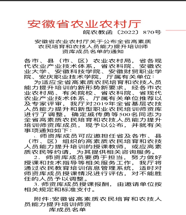 为适应全省高素质农民培育和农技人员能力提升培训的新形势新要求,经各市农业农村局、有关院校、省农科院、省现代农业产业技术体系、厅属有关单位推荐以及专家评审,威尼斯官网方晓红等十名同志成为全省高素质农民培育和农技人员能力提升培训师资库成员。
