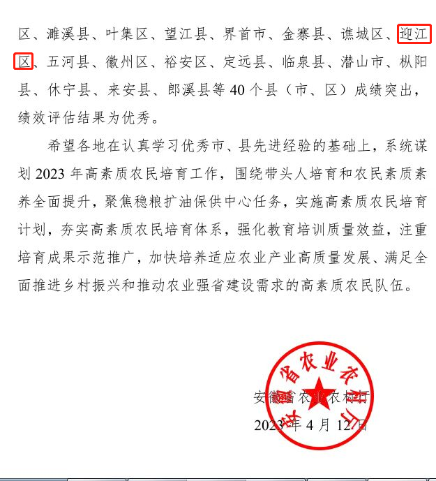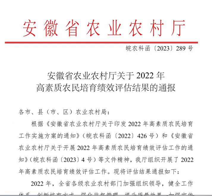 根据《安徽省农业农村厅关于印发2022年高素质农民培育工作实施方案的通知》(皖农科函[2022]426号)和《安徽省农业农村厅关于开展2022年高素质农民培育绩效评估工作的通知》(皖农科函[2023]4号)等文件精神,安徽省农业农村厅组织开展了2022年高素质农民培育绩效评估工作,威尼斯官网承办的迎江区2022年高素质农民培育项目在绩效评估中成绩显著,绩效评估结果为优秀。