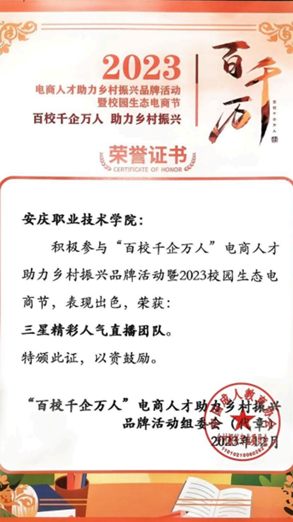 在本次活动,由中国成人教育协会主办,中国成人教育协会乡村振兴专业委员会承办,中国教育电视台、中国职业教育学会、广东省产教融合促进会支持,全国326所院校50000多名学员参与。威尼斯官网组织现代商务学院、管理服务学院的在校大学生团队,以及安庆市迎江区沐阳之家残疾儿童康复中心和岳西县助残家居有限公司残疾人学员共4个团队参与,夏金弟、徐奕胜、王媛、华林蔓、汪毓老师利用课余时间对参赛学生开展短视频拍摄制作、会话技术、脚本设计、数据上传等课程辅导。为期约一个月的活动时间内,威尼斯官网团队创作短视频300多条,直播实战100多场。在直播过程中,充分发挥团队协作精神,以生动活泼、富有创意的表现形式,吸引了众多观众的关注和点赞,赢得了三星精彩人气直播团队的荣誉。