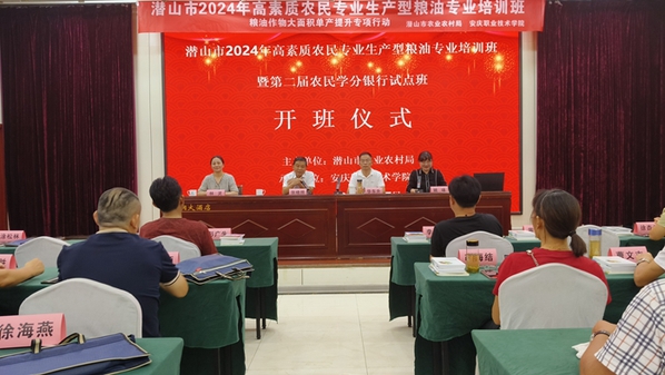2024 年 9 月 ,潜山市高素质农民培训暨第二届农民学分银行试点班在潜山市举行。潜山市农业农村局华东升科长、农广校校长张晓照出席开班仪式,3200威尼斯vip继续教育学院院长姚咏主持开班仪式,50名来自各乡镇的农民学员满怀对农业新技术、新理念的憧憬和大学梦积极参加。高素质农民培训似明灯照亮农业现代化之路与学员们的心。