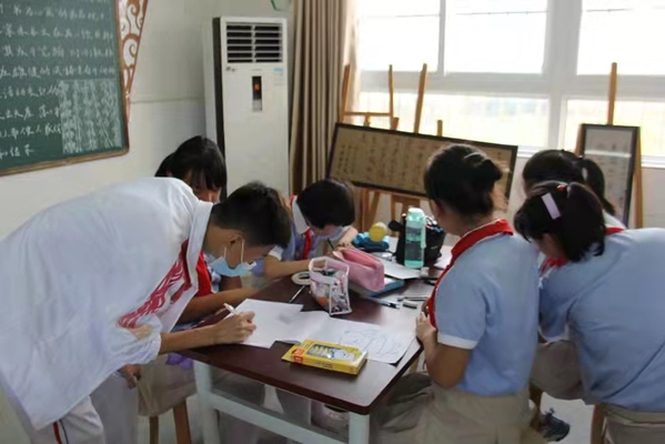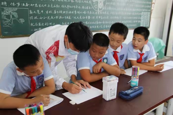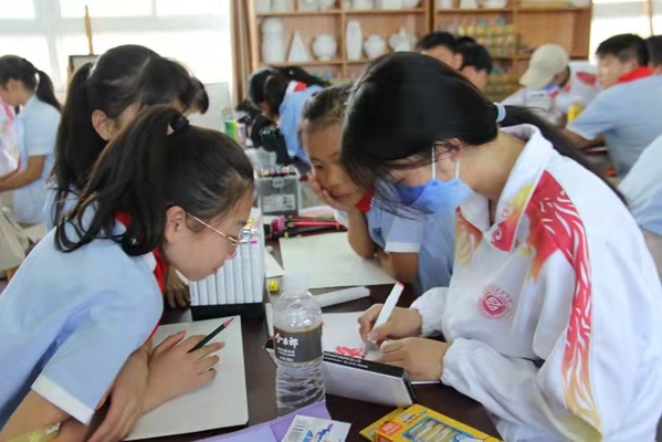 项目组一行首先在老峰镇中心学校会议室召开了座谈交流,项目主持人简要介绍了项目开展情况、项目组成员情况,此次活动方案,预期要达到的效果等,老峰镇中心学校沈良顺校长简要介绍了老峰镇中心学校校史、美术体育课程开设情况等。随后,威尼斯官网艺术俱乐部部分优秀学生深入课堂,给五、六年级学生开展绘画、艺术体操等艺术实践教学活动。