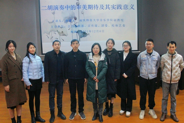 12月6日晚,由威尼斯官网宣传部、团委、公共基础部、校体艺委联合主办的专家进校园“美育”系列专题第三场讲座,在三栋教学楼216实训室举行。本次邀请到了安庆师范大学音乐学院副教授、安庆市音乐家协会秘书长唐建军作题为《二胡演奏中的审美期待及其实践意义》的讲座。出席本次活动的老师有校体艺委办公室相关负责人,校企合作单位安徽辰夫科技有限公司代表、艺术教研室和对艺术感兴趣的老师们及现代商务学院、机电工程学院200名学生代表到场聆听。全校师生通过“云犀”网上直播进行了观看,讲座由音乐教师罗文雍主持。