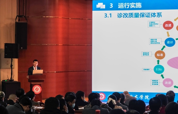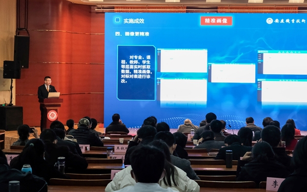 毕明生作题为《深耕内涵建设,打造办学特色,以教学诊改全面推进学校高质量发展》的工作汇报,从诊改思路、两链打造、螺旋运行、引擎驱动、信息化平台、高职扩招、成效与反思等七个方面汇报了学校教学诊断与改进工作开展情况。