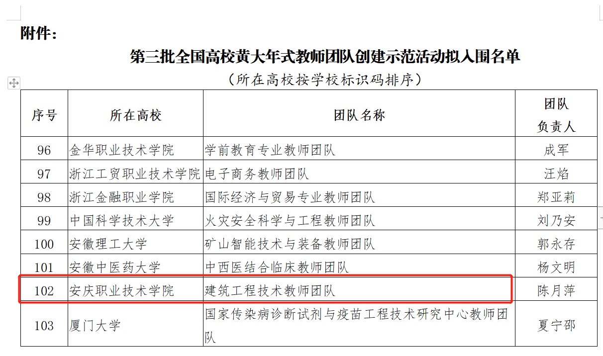 7月28日,教育部发布《关于第三批全国高校黄大年式教师团队创建示范活动拟入围名单的公示》,威尼斯官网陈月萍教授领衔的建筑工程技术团队成功入选,全国仅30所高职院校,威尼斯官网是安徽省唯一入选的高职院校。