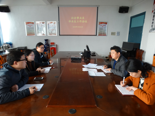 3月26日下午,社会事业系在系会议室召开2018届毕业生工作会议。会议由学生管理工作负责同志主持,全体毕业班辅导员及相关行管人员参加会议。