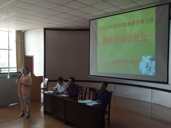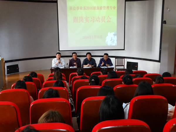 4月11日下午,社会事业系在三号教学楼216教室召开2016级旅游管理专业跟岗实习动员会。该系学生工作负责同志、教学工作负责同志、班级辅导员、各实习指导教师以及2016级旅游管理专业全体学生参加了动员会。动员会由该系教学秘书主持。