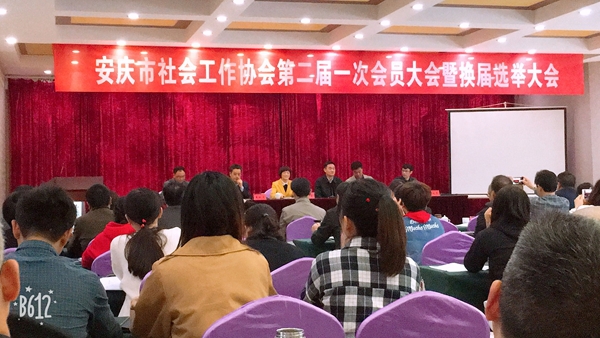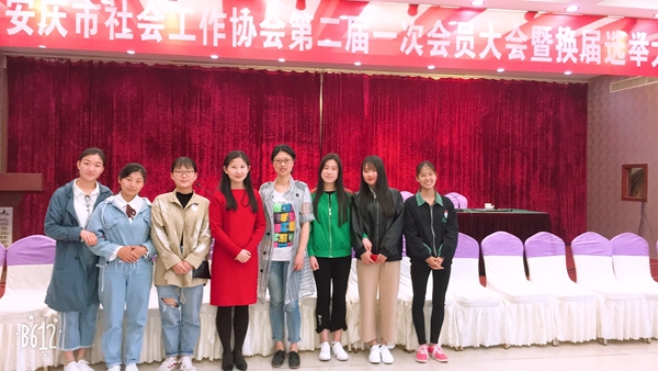 4月14日,安庆市社会工作协会第二届一次会员大会暨换届选举大会在皖源国际大酒店隆重召开,社会事业系徐妍、冯丰等四名老师及17级老年服务与管理专业六名同学受邀参加了会议。