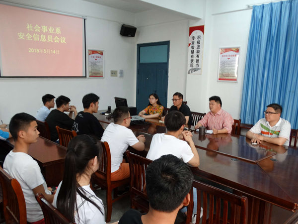 为进一步做好学生安全工作,落实学院相关会议精神,社会事业系于5月14日下午在系会议室召开学生安全工作专题会议。会议由该系分管学生工作负责任人主持,全体辅导员参加会议。