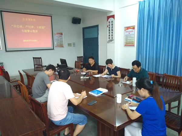 7月10日上午,社会事业系党总支在系会议室召开“讲忠诚、严纪律、立政德”专题警示教育学习会。会议由系党总支副书记、系主任高润霞主持,系党总支全体成员参加学习会。