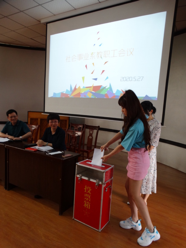 5月27日下午,社会事业系在3号教学楼216教室举行学院第三届教代会和工代会(以下简称“两代会”)代表选举大会,该系全体教职工参加选举。会议由系主任高润霞主持。