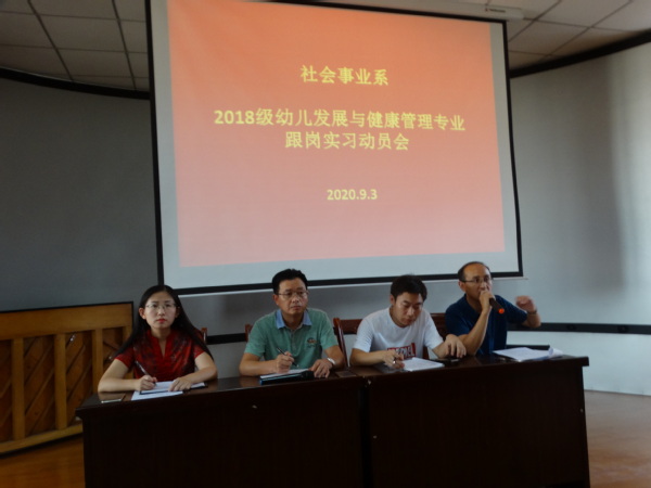 9月3日下午,社会事业系在3号教学楼216教室召开2018级幼儿发展与健康管理专业跟岗实习动员会。系教学工作负责同志、全体实习指导老师、班级辅导员以及2018级幼儿发展与健康管理专业同学参加了动员会。动员会由系教学秘书主持。