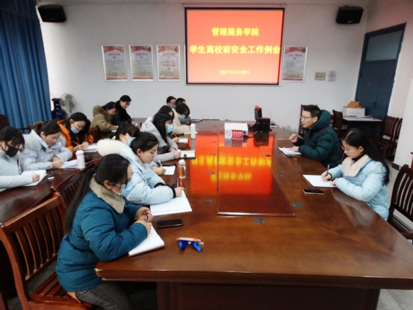 为进一步加强学生离校安全教育,促进文明离校、安全离校、度过一个愉快的寒假。2021年1月6日下午,管理服务学院学生管理科在3号教学楼314会议室组织召开期末学生安全工作专题会议,全体辅导员班主任参加会议。