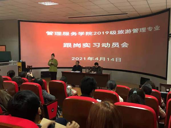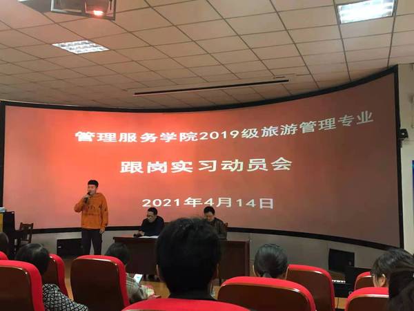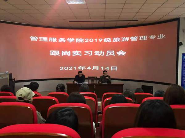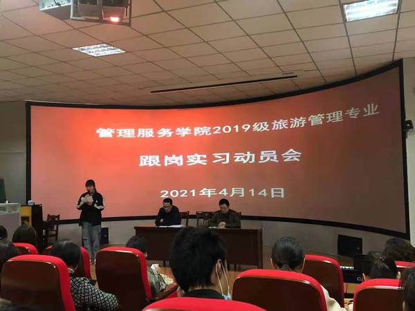 4月14日下午,管理服务学院在3号教学楼216教室召开2019级旅游管理专业跟岗实习动员会。副院长杨厚松出席会并讲话;全体实习指导老师、班级辅导员以及2019级旅游管理专业全体同学参加了动员会;安徽联众旅游投资管理公司董事长何彪、安庆安之旅旅行社总经理梁峰、安徽小龙山生态旅游发展有限公司运营总监宋文君、安徽查之家农业观光农场有限公司人力总监程君、安庆碧桂园凤凰酒店人力总监何露露、安庆栢景国际酒店人力总监刘婷等10余家旅游企业代表受邀莅临动员会。动员会由旅游管理专业建设负责人何刘杰主持。