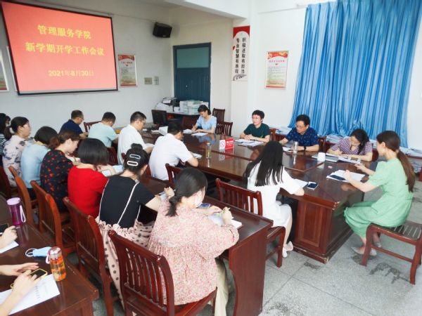 8月30日上午,管理服务学院在本院会议室召开新学期开学工作会议,全面部署新学期工作。会议由党总支书记、院长高润霞主持,全体教职员工参加会议。