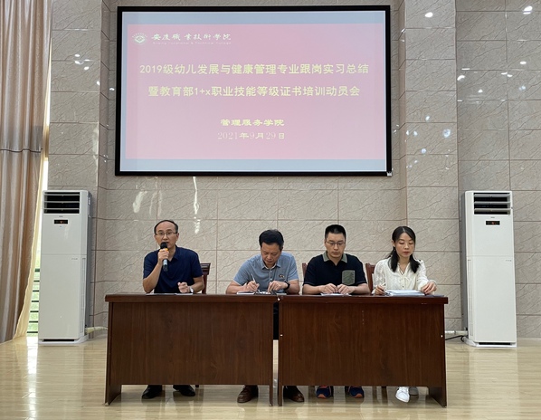 2021年9月29日下午,管理服务学院在三号教学楼316教室召开2019级幼儿发展与健康管理专业跟岗实习总结暨教育部1+X职业技能等级证书培训动员会。副院长杨厚松出席会议,学院教学管理科科长、跟岗实习指导老师、班级辅导员、2019级幼儿发展与健康管理专业各班级学生代表200余人参加了会议。会议由幼儿发展与健康管理专业建设负责人主持。