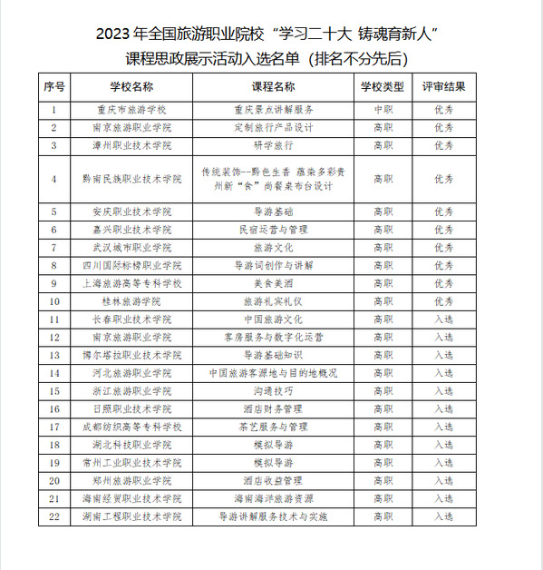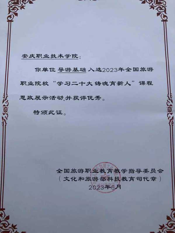 文化和旅游部6月6日公布2023年全国旅游职业院校“学习二十大 铸魂育新人”课程思政展示活动评选结果。3200威尼斯vip《导游基础》课程入选优秀案例。本次课程思政展示活动面向全国中高职院校旅游类专业基础课和专业课教师共征集了60余个课程教学案例,通过专家评审遴选,22个课程入选展示活动,最终从入围案例中选出10个优秀课程代表参加现场展示交流,3200威尼斯vip旅游管理专业李荣、华林蔓、吴紫英三位老师报送的导游基础课程案例“宣纸纸寿千年”被评选为优秀案例并参加现场展示。