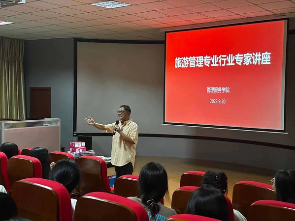 安庆蓝天旅行社总经理何彪梳理了安庆市旅行社行业的发展历程,并结合自身的成长历程介绍了旅游人的职业发展,他勉励同学们认真学习专业知识,提升专业技能,努力成为一名优秀的旅游人,讲座现场氛围热烈,何彪幽默风趣的讲解赢得了同学们的阵阵掌声。