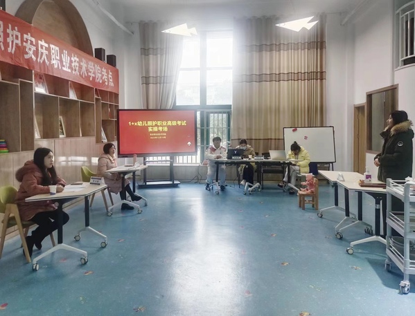 本次幼儿照护(高级)技能证书考试分为理论考试和实操考试两场,50名考生分别在机房和幼儿实训楼进行两项考试。理论考试主要测试考生婴幼儿照护、卫生保健、生活照料、早期教育等方面的知识与素养,实操考试测试学生在听障儿童筛查与鉴别、婴幼儿个性化家庭教育、婴幼儿家庭环境创设、婴幼儿食谱设计、托幼机构地震灾害的预防与演习等多项技能,考生在6项实操技能中抽签进行两项技能展示。当日,实操考试前,考评员、督导员、相关工作人员等召开了考前沟通会。会上,考评组组长对考评内容及评分标准等进行分析强调,布置细节流程。上午8:00,实操考评正式开始。引导员从候考室带领4名考生进入备考间;备考间监考人员组织考生抽取试题、准备用物;志愿者带领进入实操考场。本次实操考试分为两个考场,每个实操考场内1个工位进行实操考试,2位考评员逐一针对该考生的表现进行评分;评分完毕,计分员立即进行登记和汇总,整个考试过程有条不紊。