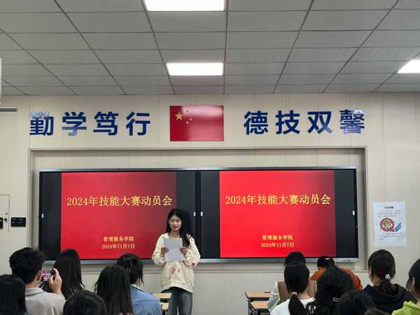 动员会特别邀请了企业专家吴康睿为全体师生解读2024年世界技能大赛规程,全面解读2024年赛项及规程调整情况,精准把握技能大赛的新导向;何世亮老师结合自身2024年世界技能大赛争夺赛现场裁判的经验,以幼儿照护赛项为例,从现场执裁视角分享了比赛过程中的关键点,给出了参赛团队打磨强化作品的注意事项,为参赛师生提供了清晰明了的备赛思路;经验分享环节,邀请刚刚获得2024年世界职业院校技能大赛国际组电子信息赛道二铜奖的潘晨羊同学作经验分享,潘晨羊从参赛角度出发,为同学们阐述参加技能大赛参赛的收获以及如何制定并执行备赛计划。随后,指导老师代表华林蔓、参赛学生代表王静分别作了表态发言。