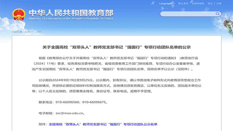 9月19日,教育部公布了《关于全国高校“双带头人”教师党支部书记“强国行”专项行动团队名单的...