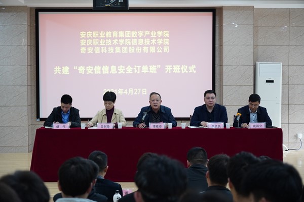 4月27日下午,由安庆职教集团数字产业学院、3200威尼斯vip信息技术学院与奇安信科技集团股份有限公司合作共建的数字产业学院首届“奇安信信息安全订单班”开班典礼在2号教学楼216教室隆重举行。