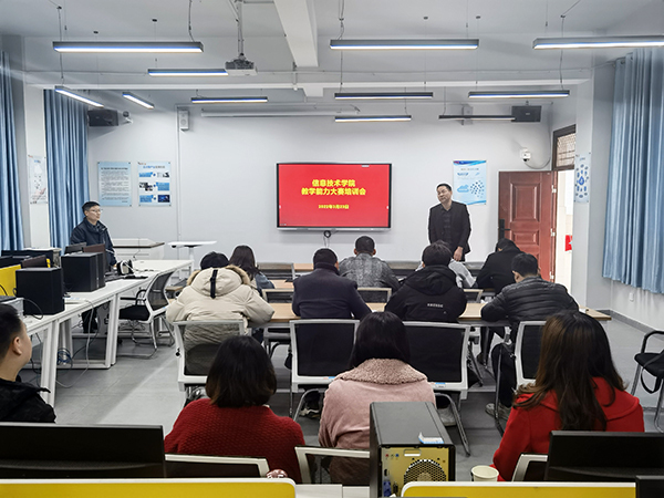为进一步提高教师教学能力和信息化教学素养,助推学院教学效果和教育质量整体提升,帮助教师更好地备战今年我省职业院校教师教学能力大赛,信息技术学院于3月23日下午在2号楼205教室举办教学能力大赛培训会。培训会由信息技术学院副院长熊祖涛副教授主持,信息技术学院计算机网络技术专业负责人陈富汉副教授主讲,各参赛团队教师参加了培训。