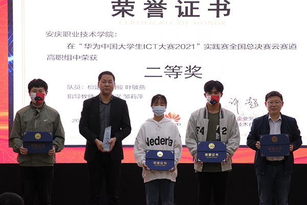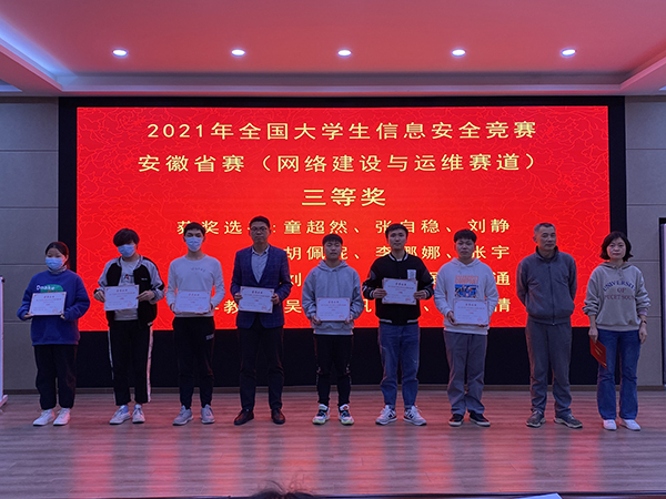 会议首先分享了计算机网络技术专业去年以来基于“岗课赛证”融通的人才培养模式所取得的各项成果,指导教师为获奖学生颁发了第十八届 “振兴杯”全省青年职业技能大赛计算机程序设计员(云计算平台运维与开发)赛项二等奖1项、2021年安徽省大数据与人工智能应用竞赛三等奖3项、2021年华为中国大学生ICT大赛安徽省决赛(云赛道)一等奖1项、2021年华为中国大学生ICT大赛安徽省决赛(网络赛道)二等奖1项、2021年全国大学生信息安全竞赛安徽省赛(网络建设与运维赛道)一等奖1项、二等奖1项、三等奖3项,2021年全国大学生信息安全竞赛安徽省赛(网络攻防大赛)二等奖1项,华为中国大学生ICT大赛2021全国总决赛二等奖1项。