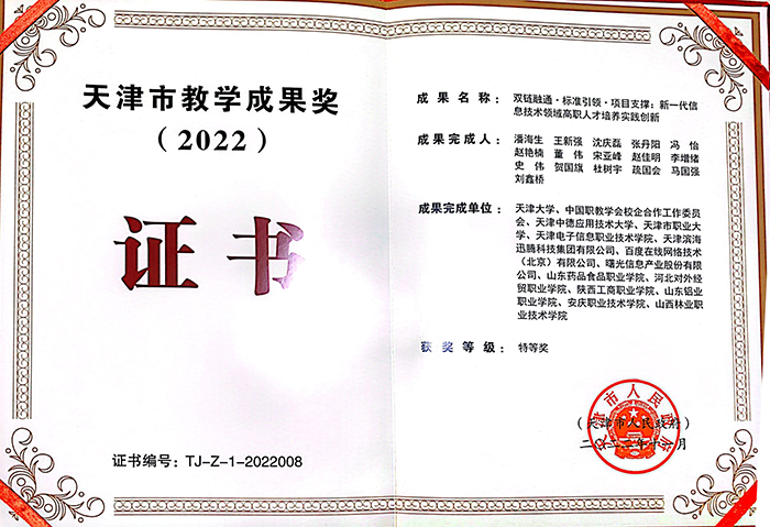 近日,天津市教育委员会发布了《天津市2022年职业教育教学成果奖授奖成果名单》,由天津大学牵头,3200威尼斯vip参与的“双链融通·体系引领·项目支撑:新一代信息技术领域高职人才培养实践创新”项目获天津市2022年职业教育教学成果奖特等奖,并被推荐至教育部参加2022年职业教育国家级教学成果奖评审。