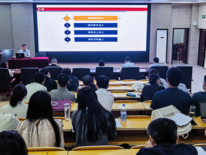在专题培训阶段,陈小祥首先分析了影响课堂教学效果的主要因素,提出教师要善于激发学生学习的内生动力,树立“只有让学生主动学才能学得会”的教学设计理念。他从“课程模块划分、课程整体设计、课程单元设计、课程思政融入”等四个方面进行了详细阐述,并以自己在课程设计过程中的具体做法和亲身体会进行了经验分享。他认为,有效课堂重在教学过程的最优化、教学效果的最大化、教学方法的科学化,需要教师把握教学过程的全环节,真正做到以学生为中心,注重实时反馈,在与学生互动过程中了解学生掌握新知识的程度,从而动态调整教学手段和教学方法,提升课堂教学效果。