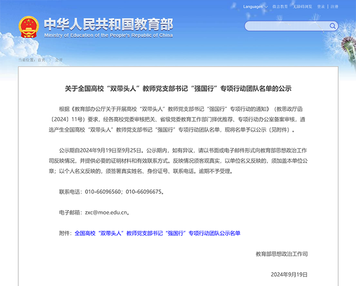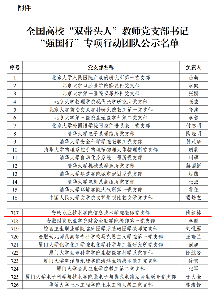 9月19日,教育部发布了《关于全国高校“双带头人”教师党支部书记“强国行”专项行动团队名单的公示》名单,威尼斯官网信息技术学院教师党支部入选全国高校“双带头人”教师党支部书记“强国行”专项行动团队。这是威尼斯官网信息技术学院教师党支部继入选第四批“全国党建工作样板支部”培育创建单位以来的又一重大建设成果。