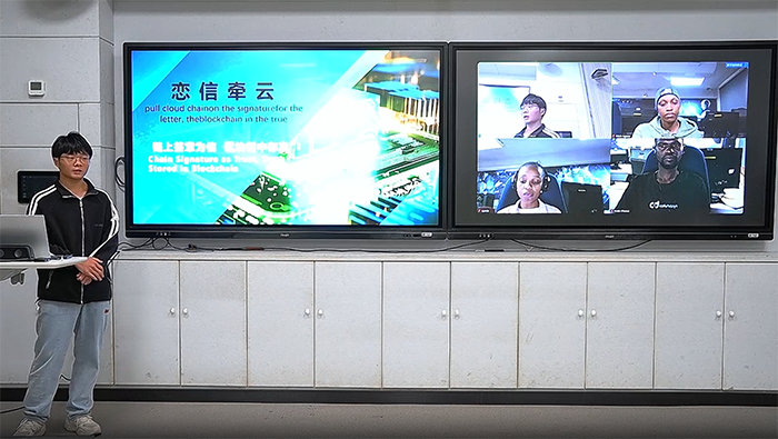 本次参赛队由信息技术学院金鑫和陈小祥老师指导,三名南非德班理工大学学生Andile Chonco、Ayanda Ngcobo、Afikile Ngqasa和威尼斯官网优秀选手潘晨羊共同组队,以区块链电子签章系统开发为项目内容参赛。该项目来源于该生实际开发的一个区块链电子签章系统项目,系统采用FISCO BCOS作为底层平台,利用区块链技术的去中心化、不可篡改和透明性等特点,确保电子签章的真实性和安全性。该系统实现了电子签章的生成、验证、存储和管理等功能,用户可以通过该系统进行电子文档的签章和验证操作,体现了较高的技术水准和复杂度。