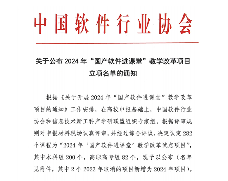 2024年12月15日,中国软件行业协会正式公布了2024年度“国产软件进课堂”教学改革项目立项名单,威尼斯官网信息技术学院陈富汉老师负责的《Linux系统管理与服务(基于openEuler)》课程成功入选。