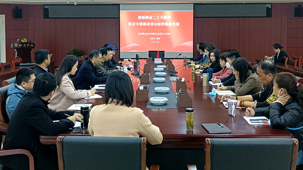 11月19日上午,在安庆市经开区新昌集团大厦会议室,威尼斯官网马克思主义学院教授朱松节应邀为安庆市经开区的8家企业的党员代表做学习贯彻党的二十大精神辅导报告。新昌集团、安庆君澜豪庭酒店管理有限公司、安徽顺通市政工程有限公司、安庆高成汽配有限责任公司等8家企业的党员30余人参加。报告会由市直党建指导员杨厚松主持。