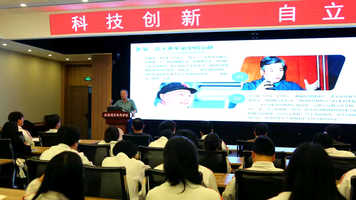 课堂上,谭维奇结合学生们喜爱的科技创新类影视剧作,引用身边人身边事,讲授了“世界科技竞争日趋激烈、我国科技机遇挑战共存、安庆科技创新自立自强、加快科技自立自强步伐”四个部分内容。谭维奇教授从国际视角带领学生看世界科技竞争日趋激烈,分析了科技创新广度显著加大、深度显著加深、速度显著加快、精度显著加强;从国内视角带领学生清醒认识我国科技面临的机遇与挑战,并且和学生一起探讨如何解决在科技创新方面面临的诸多问题;从地方视角带领学生领略安庆科技创新的自强自立,用邓稼先、慈云桂、朱枞鹏和威尼斯官网校友吴友胜等身边人,用校内的寿芳亭等身边事,讲授了安庆在四次工业革命中的贡献。最后,谭维奇寄语同学们,青春扬帆,不负韶华。只要我们坚定信心、砥砺奋进,走好新时代科技自立自强之路,就一定能勇攀科技高峰。