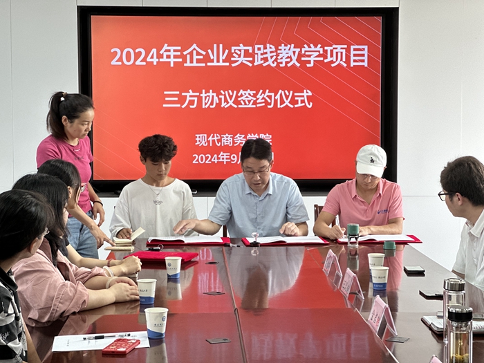 9月25日,现代商务学院与安徽云霁电子商务有限公司的2024年学生电商客服岗位实训教学项目签约仪式在学校3号教学楼510会议室举行。云霁电商公司总经理汪义德及公司相关领导,现代商务学院党总支书记、院长金启胜,该院学生工作负责人,电子商务专业负责人、跨境电子商务专业负责人以及相关班级辅导员和学生代表参加签约仪式,会议及仪式由该院教学工作负责人主持。