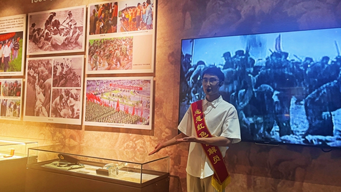 岳呈祥同学为了更好的完成讲解工作,提前研究学习相关的历史资料、努力提高讲解水平。在讲解的过程中,他用清晰而富有感染力的声音讲述着革命先辈的英雄事迹并耐心解答参观者的疑问,进一步加深参观者们对这段艰辛的红色岁月的理解与感悟。