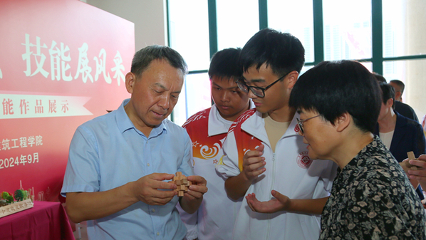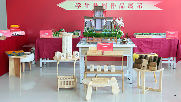 走进展厅,首先映入眼帘的是建筑工程学院的“匠心迎国庆 技能展风采”建筑作品展,这是由建筑装饰工程技术专业和建筑工程技术专业的师生们耗时三个月共同打造完成的。作品《云深雾阁》、《梦栖海滩》、《荷塘月色》、《天安门》等,以建国75周年为主题,将中国传统古建筑与美好居住环境设想完美结合;木制工艺以木制浮雕、鲁班锁、木质书签、漆扇等,采用凹凸部位相结合的连接方式,再将表面打上木蜡油,对中国古代榫卯结构,大漆制作手工艺有了不同的诠释;模型展示以实物模型、3D模型图以及手绘素描等作品形式,不仅展示了古代建筑风格,也诠释了现代建筑新格局。不仅展示了该院各专业的交叉融合,并且希望培养出能识图、能看图、会画图、懂设计、能施工,更能传承中国的传统文化和技艺的高素质技能型人才。
