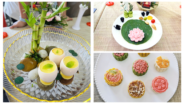 农林与服装学院以“繁荣昌盛 食美天下”为主题的食品展,由食品质量与安全专业和园艺技术专业的师生们耗时一周共同打造完成。食品专业展出的作品《荷塘月色》、《安庆印象》、《鱼戏莲间》,将建国75周年主题、两大专业技能、中国传统文化、安庆地方特色等完美融合;园艺技术专业展出作品分为传统与现代两大模块:传统六大花器为基地,选用不同的花材,采用剑山和撒固定基板,对中国传统插花中的不同花器予以完美展示。现代插花作品在传承的同时,也从历史长河中汲取智慧,融入现代科技的创新精神,通过现代插花展现引领时代的潮流。该学院两大专业师生将第一课堂与第二课堂深度结合,协同育人,突出了校园美育文化的同时,也增强了同学们专业实践能力。