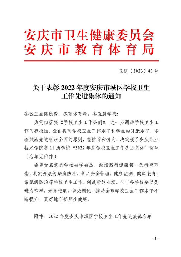 后勤保障处在校党委坚强领导下,贯彻落实《学校卫生工作条例》,始终践行健康第一的教育理念,扎实开展传染病防控、食品安全管理、健康教育、健康监测、常见病防治等学校卫生工作。受到市教体局和卫健委的高度肯定,荣获2202年度安庆市城区学校卫生工作先进集体光荣称号。(文:陶勇平审稿:程立)